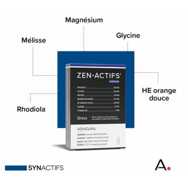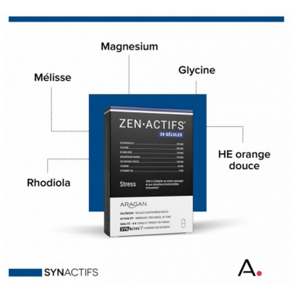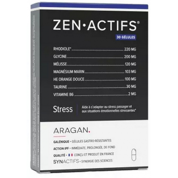 Grâce à sa composition riche en extraits de plantes en glycine taurine magnésium marin et vitamine B6 le complément alimentaire Zenactifs® offre une solution naturelle et efficace pour apaiser les situations de stress passager et les situations émotionnelles stressantes. La rhodiola la glycine et la mélisse agissent en synergie pour aider l-organisme à s-adapter au stress tandis que le magnésium marin et la vitamine B6 contribuent au bon fonctionnement du systeme nerveux et à la réduction de la fatigue.