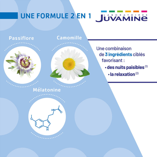 Complément alimentaire à base de mélatonine, de passiflore et de camomille pour contribuer à passer une bonne nuit. En savoir +