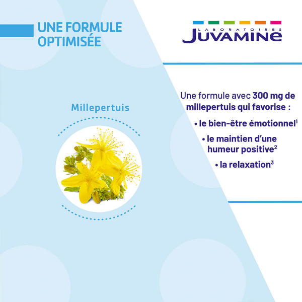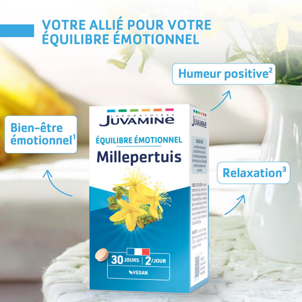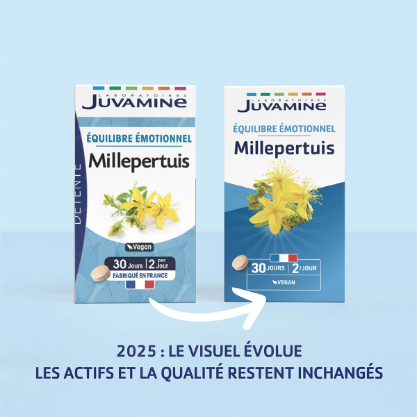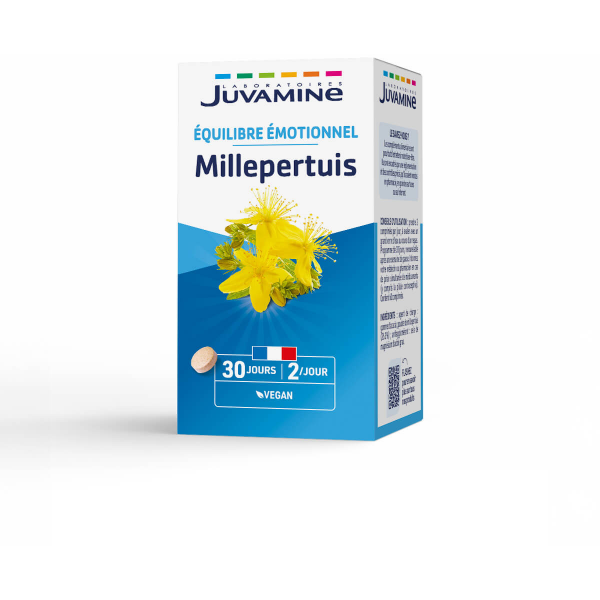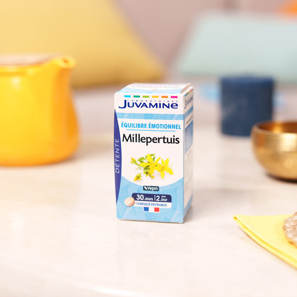 Le Millepertuis, Equilibre émotionnel, est un complément alimentaire proposé par les Laboratoires Juvamine pour favoriser le maintien de l'équilibre émotionnel. Avec sa formule à base de Millepertuis, une plante vivace d'origine eurasienne, ce produit est spécifiquement conçu pour contribuer à une humeur positive et soutenir la relaxation. En plus de ces bienfaits, le Millepertuis aide à maintenir un bien-être mental et physique, tout en favorisant un sommeil sain. De la formulation au produit fini, les Laboratoires Juvamine mettent à profit plus de 30 ans d'expertise dans les compléments alimentaires pour offrir un produit conçu pour aider à retrouver le bien-être grâce à des actifs naturels aux vertus reconnues.