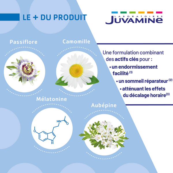 Agent de charge : maltitol ; extrait de passiflore (3%) ; gélifiant : pectine ; acidifiant : acide citrique ; extrait de camomille (0.8%) ; arà´me naturel fruits des bois ; extrait d-aubépine (0.5%) ; acidifiant : citrates de sodium ; concentré (carotte et cassis) ; agent d-enrobage : cire de carnauba ; mélatonine (0.04%).