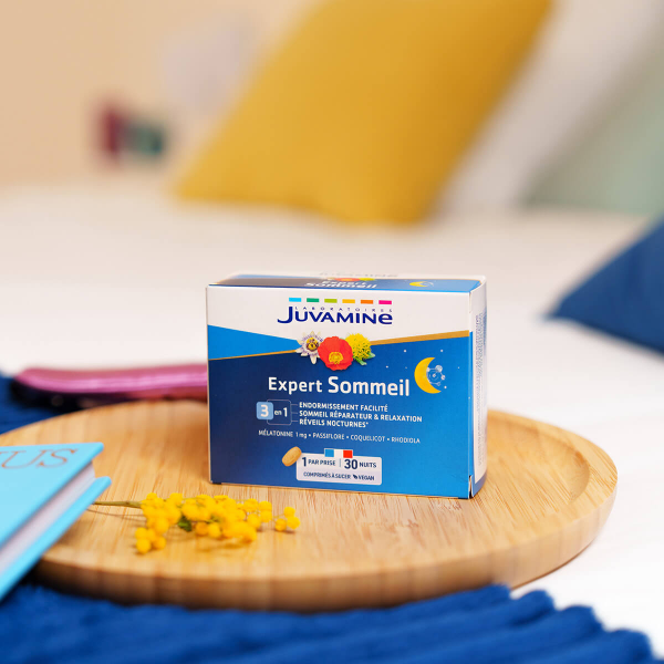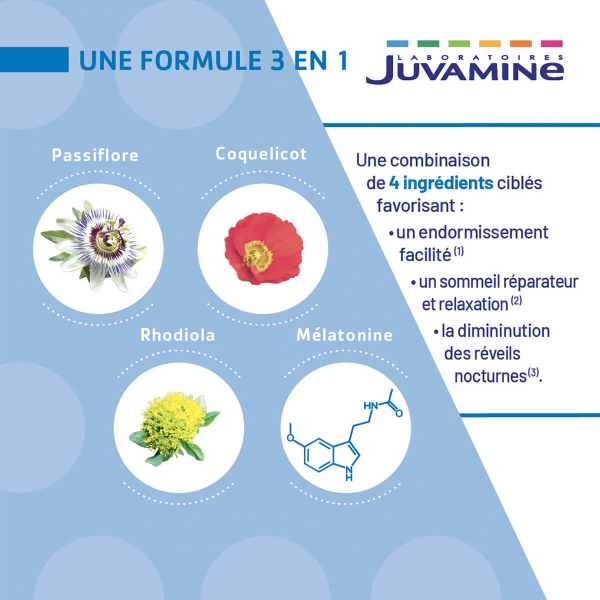 Ce complément alimentaire contient de la mélatonine, une hormone naturellement produite par l'organisme, qui contribue à réduire le temps d'endormissement. En associant la mélatonine aux extraits de passiflore, de coquelicot et de rhodiola, ce produit favorise la détente et aide à affronter le stress quotidien, favorisant ainsi un endormissement naturel et une meilleure qualité de sommeil.