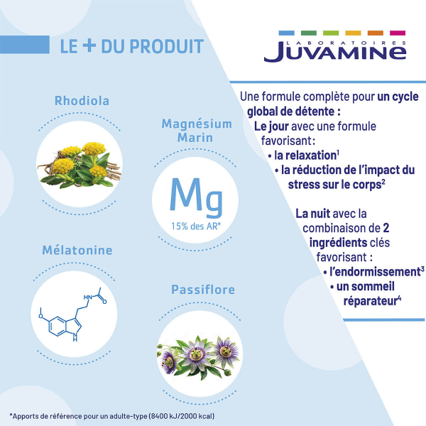 Votre allié de jour comme de nuit pour un cycle global de détente ! Complément alimentaire à base de plantes, de vitamine B6, de magnésium et de mélatonine. En savoir +