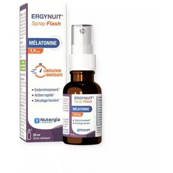 ERGYNUIT® Spray Flash est la solution pour une libération rapide de mélatonine pour diminuer le temps d’endormissement. La mélatonine aide à s’endormir plus rapidement (l’effet bénéfique est obtenu par la consommation de 1 mg de mélatonine juste avant le couch... En savoir +