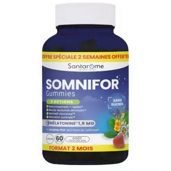Agent de charge: Maltitol Acidifiant : Acide citrique Extrait sec de parties aériennes de pavot de californie (Eschscholzia californica Cham.) Agent gélifiant : Pectine Macérat glycériné de bourgeon d-aubépine (Crataegus laevigata L.) Macérat glycériné de bourgeon de tilleul (Tilia platyphyllos Scop.) Macérat glycériné de bourgeon de figuier (Ficus carica L.) Extrait sec de racine de valériane (Valeriana officinalis L.) Extrait sec de parties aériennes de passiflore (Passiflora incarnata L.) Arome naturel Acidifiant : Citrate de sodium Concentré de carotte et cassis Antioxydant : Extrait riche en tocophérols Agent d-enrobage : Cire de carnauba Mélatonine Huile essentielle de sommités fleuries de lavande (Lavandula angustifolia Mill.).