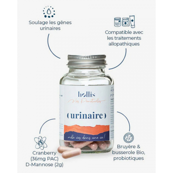 Hollis Urinaire repose sur une double action ciblée. La formule associe cranberry, bruyère et busserole, plantes traditionnellement utilisées pour la sphère urinaire, afin de soutenir les fonctions d’élimination et contribuer à l’équilibre des voies urinaires. En parallèle, l’apport en D-Mannose et en PAC aide à limiter l’adhésion des germes aux parois urinaires, favorisant ainsi leur élimination.