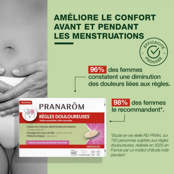 Découvrez les bienfaits du Pranarôm Aromalgic Règles Douloureuses, une solution naturelle pour réduire les douleurs avant et pendant les règles. Ce dispositif médical, spécialement conçu pour améliorer le confort féminin, offre une synergie unique d'huiles essentielles, de plantes, de vitamines et de minéraux. Grâce à sa formule à base d'huiles essentielles de lavande vraie, de gingembre et de menthe verte, associée aux extraits de plantes de grande camomille, d'alchémille et d'achillée millefeuille, ce produit agit en profondeur pour apaiser les tensions et la sensibilité corporelle. De plus, le magnésium bisglycinate et la vitamine B6 présents dans sa composition contribuent à atténuer la sensation de douleur de manière naturelle. En agissant sur l'organisme, ce complément alimentaire favorise également l'équilibre du système nerveux, participant ainsi à un meilleur bien-être.