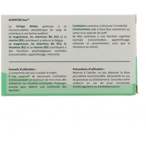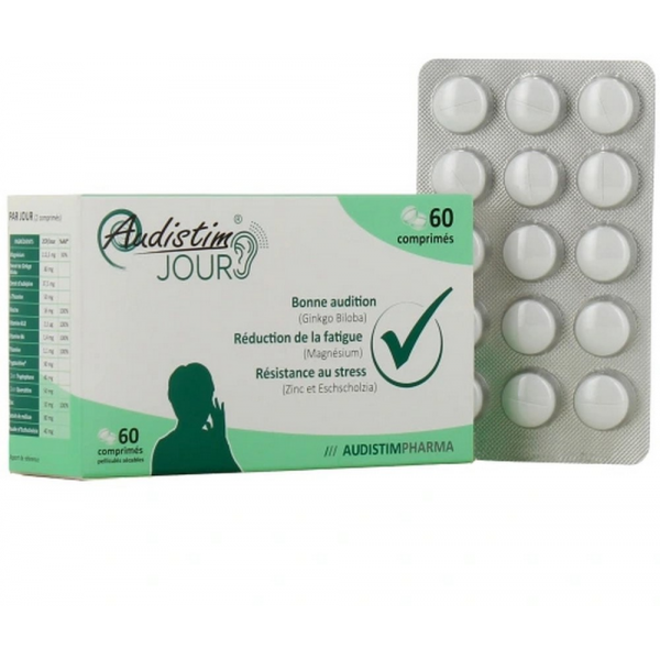 Audistim Jour est un complément alimentaire à base de vitamines et minéraux, d'acides aminés et d'extraits de plantes.