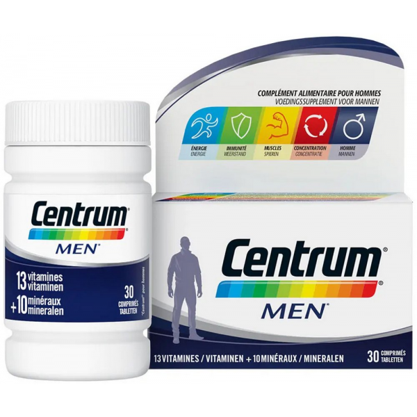 Les besoins nutritionnels de l'homme sont spécifiques et bien différents de ceux d'une femme. Pour couvrir tous les besoins en énergie, en immunité, en concentration en masse musculaire saine, Centrum Men a concentré 13 vitamines et 11 minéraux dans un complément alimentaire spécial homme.