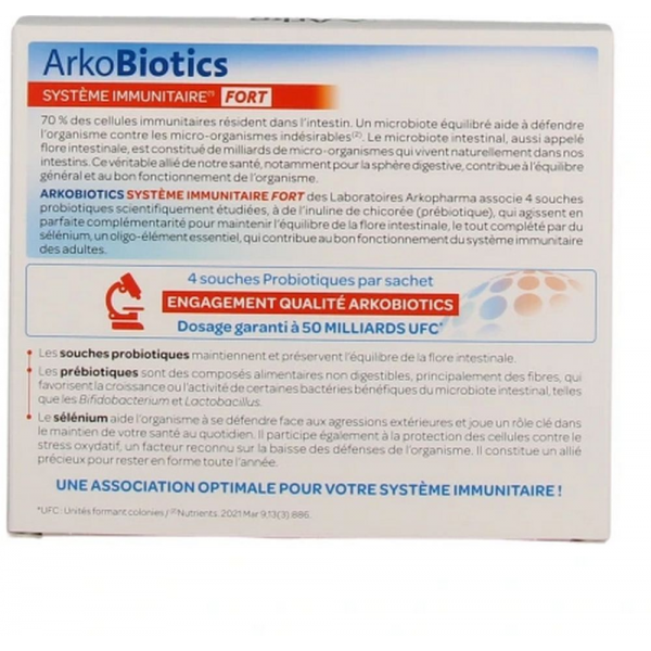 ArkoBiotics® Système immunitaire fort est un complément alimentaire à base de souches probiotiques, un prébiotique et un oligo-élement essentiel. En savoir +