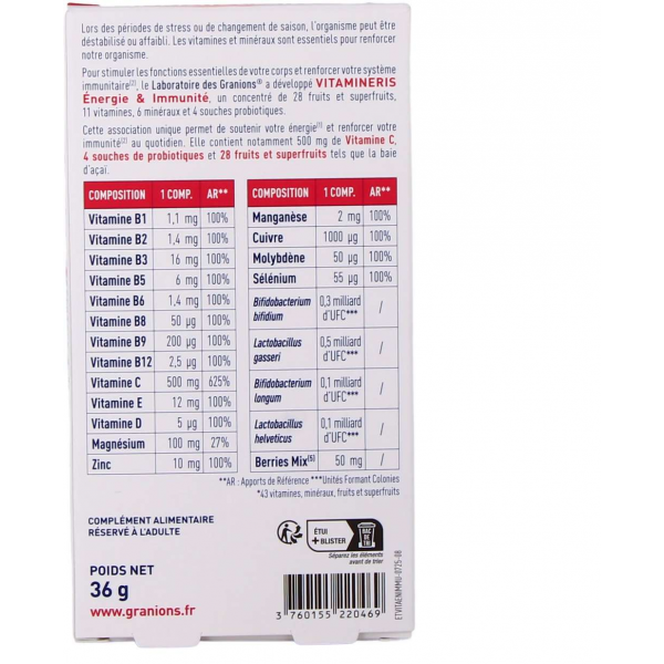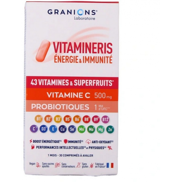 Pour stimuler les fonctions essentielles de votre corps et préserver votre capital santé, le Laboratoire des Granions® a développé VITAMINERIS Immunité 1000mg, un concentré de 12 vitamines et 4 minéraux. Cette association unique permet de soutenir votre forme physique et mentale au quotidien. Elle contient notamment 1000 mg de Vitamine C, de la Vitamine A ainsi que 1 milliard de souches probiotiques tyndallisées, qui vont agir sur le microbiote intestinal et renforcer le système immunitaire.