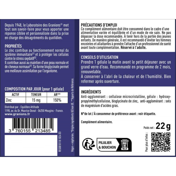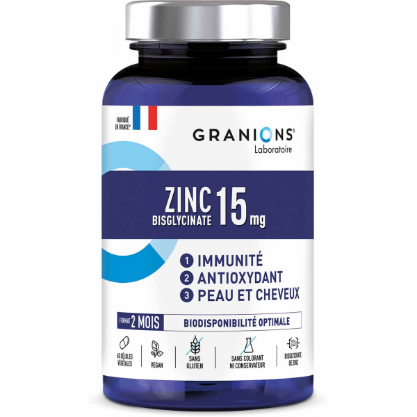 Le zinc est un oligoélément essentiel au bon fonctionnement de l'organisme. Il a un rôle dans le processus de division des cellules et permet de lutter contre le stress oxydatif. Le zinc contribue également au fonctionnement normal du système immunitaire. Ce complément peut permettre également le maintien de la peau et de cheveux normaux.