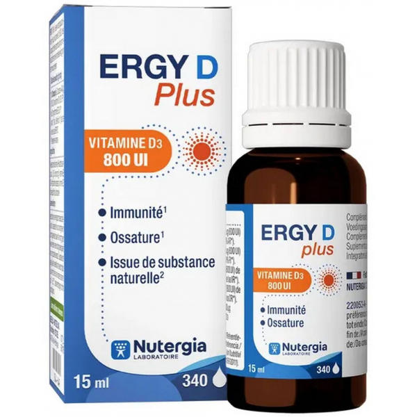 Déconseillé aux enfants de moins de 10 ans. Ces derniers peuvent prendre Nutergia Ergy D dont la concentration est moins forte. En effet, 1 goutte de ERGY D apporte 200 UI (5 µg) de vitamine D3 et 1 goutte de ERGY D Plus apporte 800 UI (20 µg) de vitamine D3.