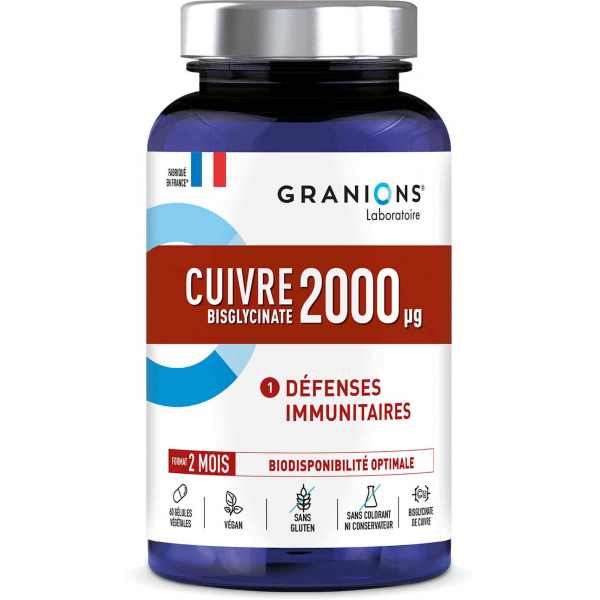 Le Cuivre est un oligoélément présent dans le corps en quantité infime. C’est le 3ème oligoélément essentiel le plus abondant après le Fer et le Zinc. Le Cuivre contribue au fonctionnement normal du système immunitaire. Sa forme bisglycinate permet une meilleure assimilation par l’organisme.