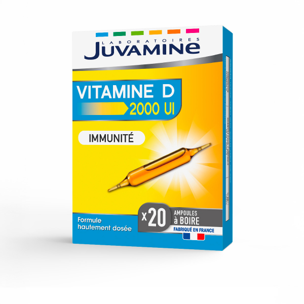 La vitamine D 2000 UI, 20 ampoules de 10 ml des Laboratoires Juvamine sont fortement dosées en vitamine D3, essentielle pour le fonctionnement normal du système immunitaire et le maintien d'une ossature normale. Cette vitamine est principalement synthétisée par la peau sous l'effet du soleil, mais notre mode de vie moderne, souvent en intérieur, limite cette exposition. De plus, pendant les périodes peu ensoleillées, notre production de vitamine D est réduite, ce qui conduit à une déficience chez 80% de la population en France. Chaque ampoule apporte 50µg, soit 2000 UI de vitamine D3, permettant de combler plus rapidement d'éventuelles déficiences.