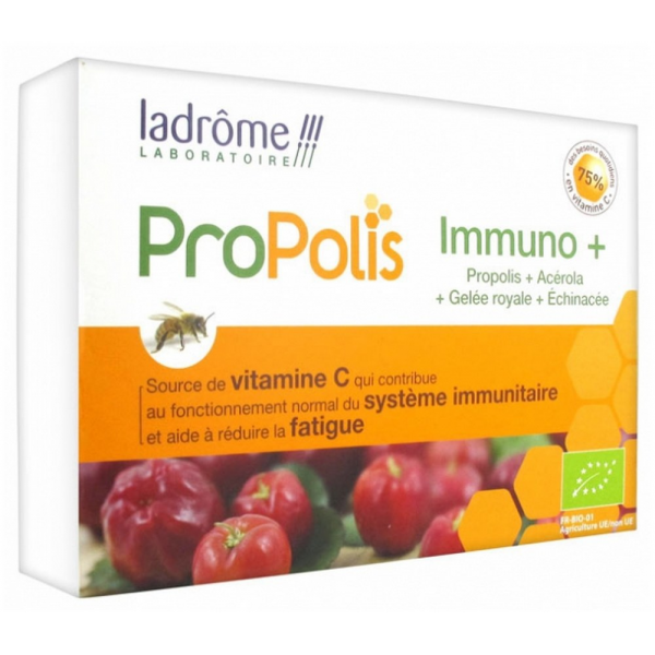 LADROME propolis immuno+ bio 20 ampoules x 10ml est un complément alimentaire proposé pour renforcer le système immunitaire et réduire la fatigue. Ce produit certifié Agriculture Biologique se compose de propolis, de gelée royale, d'extrait et de jus de plante fraîche d'échinacée pourpre, ainsi que d'acérola, riche en vitamine C naturelle. Chaque ampoule apporte 75% des besoins quotidiens en vitamine C, favorisant ainsi le fonctionnement des défenses immunitaires.