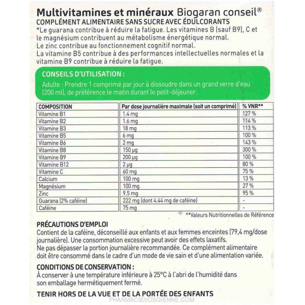 Contient de la caféine (déconseillé aux enfants et aux femmes enceintes (79,4 mg par dose journalière)).