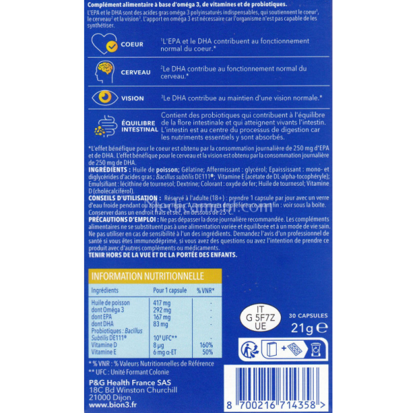 Complément alimentaire associant oméga 3, vitamines et probiotiques pour soutenir la santé du cœur, du cerveau et de la vision. En savoir +