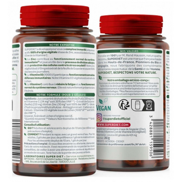 Jus concentré déshydraté d-acérola titré en vitamine C (fruit) - Extrait de goyavier titré en zinc (feuille) - Gélule d-hydroxypropylméthylcellulose - Antiagglomérant : Carbonate de calcium - Vitamine D3 végétale issue de lichen// Pour 2 gélules : 339mg d-Acérola (Malpighia glabra L.) Dont 24mg Vitamine C 233mg d-Extrait de goyavier (Psidium guajava L.) dont 10mg de Zinc soit 100% de Valeur Nutritionnelle de Référence 1 000 d-Unité Internationale de Vitamine D3 végétale soit 500% des Valeurs Nutritionnelles de Référence