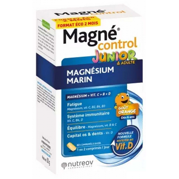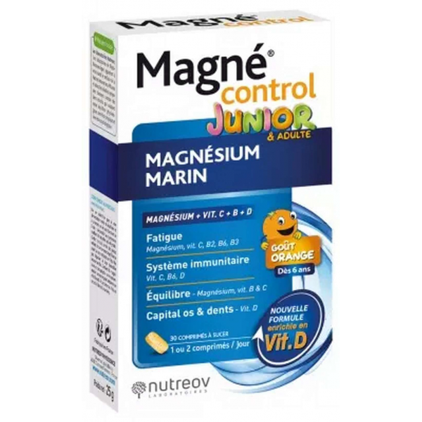 Le MAGNE CONTROL Junior est un complément alimentaire spécialement formulé pour lutter contre la baisse d'énergie, la fatigue générale et la fatigue physique, souvent liées à un déséquilibre en magnésium. Ce produit, adapté aux enfants et aux adultes, contient du magnésium marin associé à 6 vitamines pour une action antifatigue complète. Le magnésium contribue à réduire la fatigue, au fonctionnement normal du système nerveux et à des fonctions psychologiques normales. Les vitamines C, B2, B6, et B3 contribuent également à réduire la fatigue, au bon fonctionnement du système nerveux et à un système immunitaire normal. De plus, les vitamines C et B6 permettent un fonctionnement normal du système immunitaire, et la vitamine D aide à maintenir une ossature et une dentition normales.