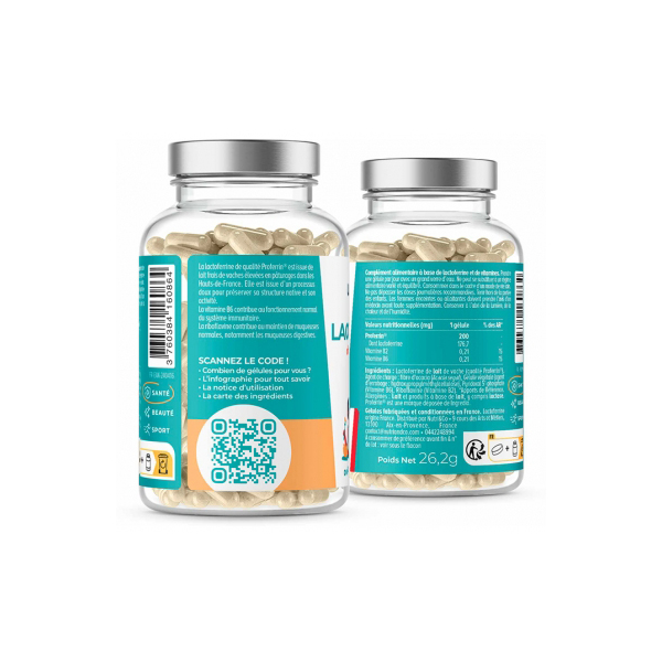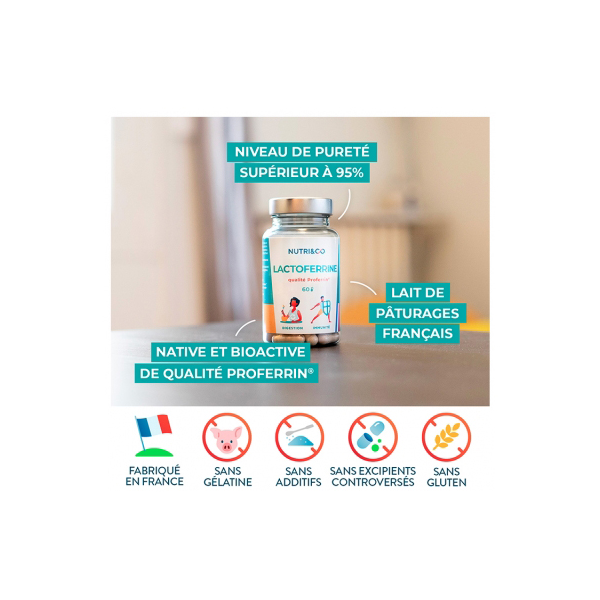 Lactoferrine de lait de vache (qualité Proferrin®) Agent de charge : fibre d-acacia (Acacia seyal) Gélule végétale (agent d-enrobage : hydroxypropylméthylcellulose) Pyridoxal 5--phosphate (Vitamine B6) Riboflavine (Vitamine B2). *Apports de Référence. Allergenes : Lait et produits à base de lait y compris lactose. Proferrin® est une marque déposée de Ingredia.