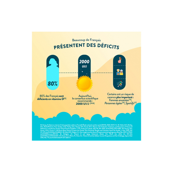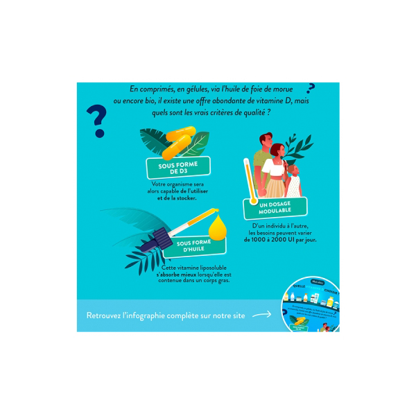 | Vitamine D3 / 1 goutte par jour | 25 mcg | 1000 UI* / 500% des AR** |