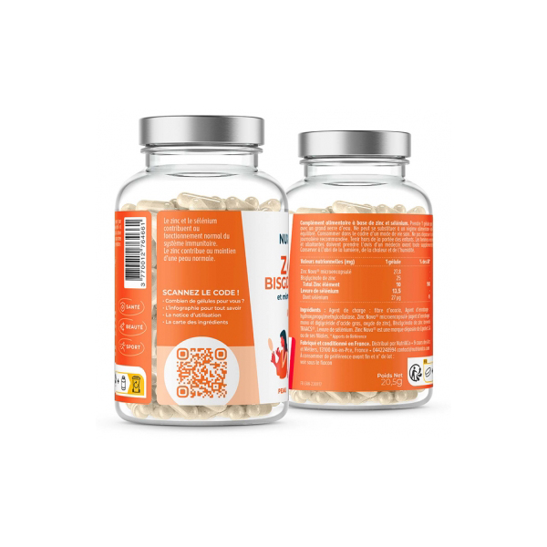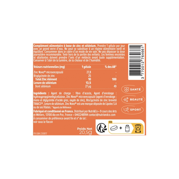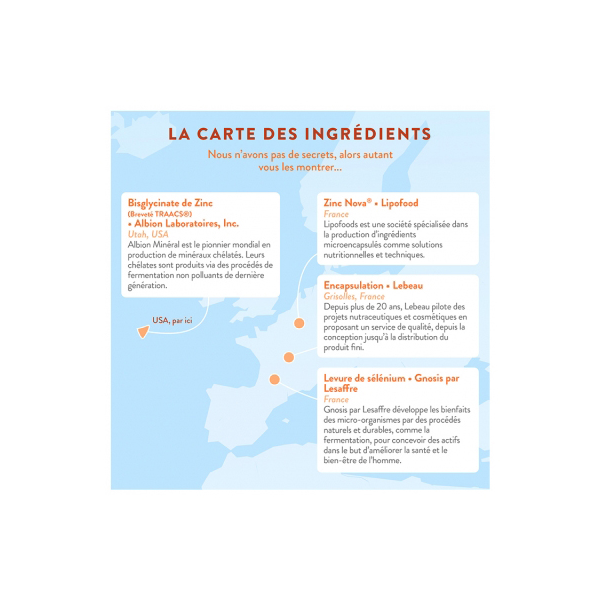 Fibres d-acacia Agent d-enrobage : hydroxypropylmethylcellulose Zinc Nova® microencapsulé (agent d-enrobage : mono et diglycéride d-acide gras oxyde de zinc) Bisclycinate de zinc breveté TRAACS® Levure de sélénium.