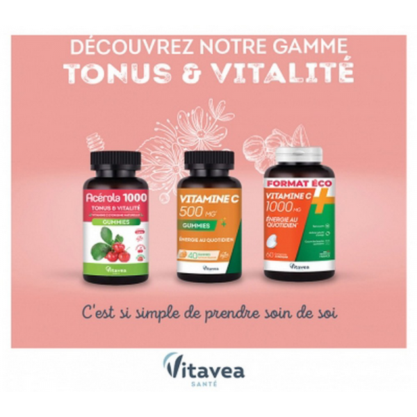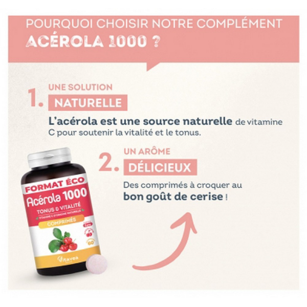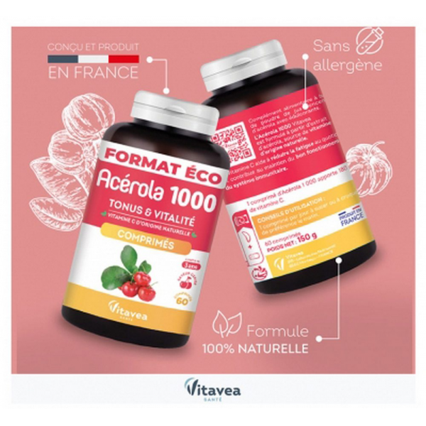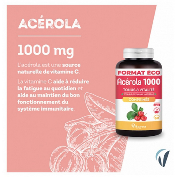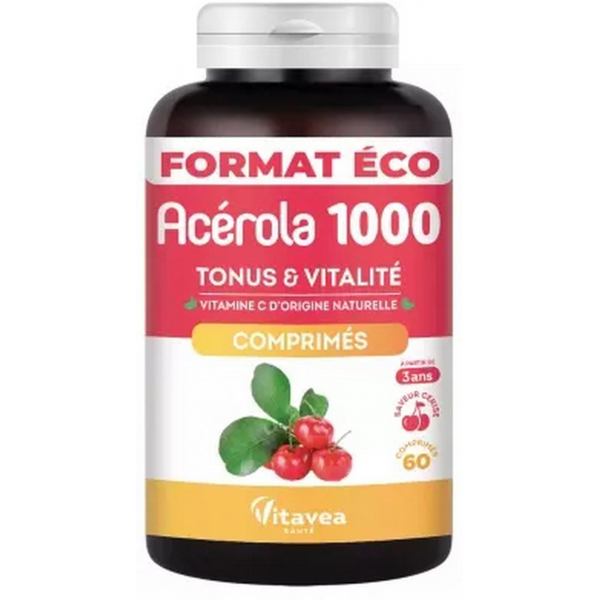 Nutrisanté Acérola 1000 est un complément alimentaire qui apporte 180 mg de vitamine C dans 1 comprimé soit 225% des VNR* journalier. Nutrisanté extrait cette vitamine C de l'acérola. Petite baie qui ressemble à la cerise, l'acérola est 30 fois plus riche en vitamine c que l'orange.