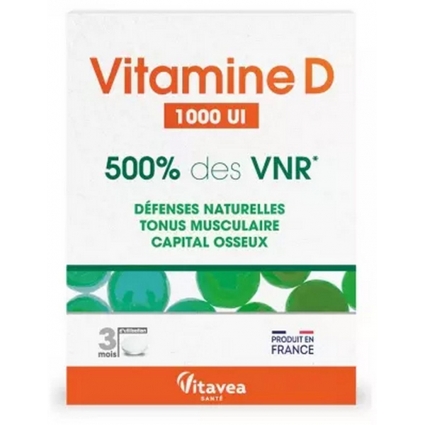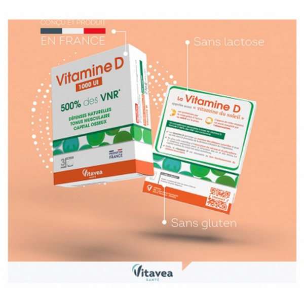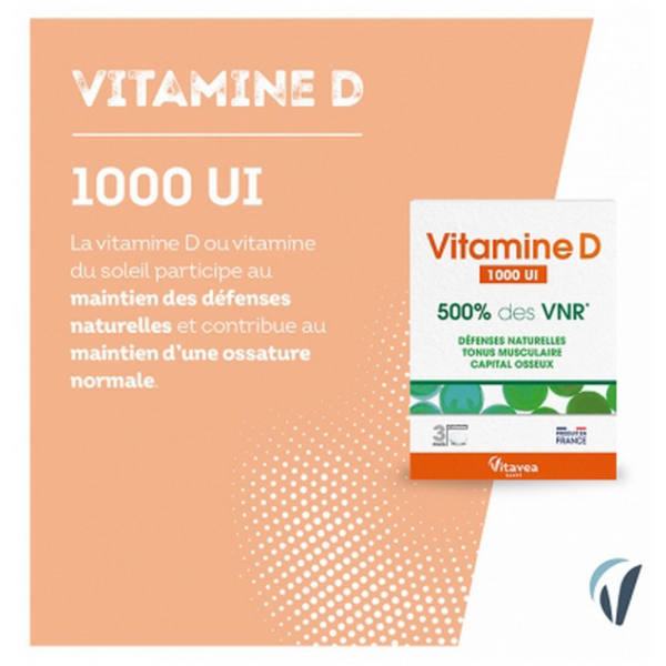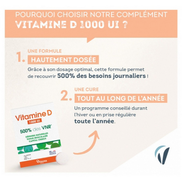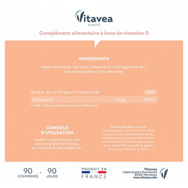 Complément alimentaire à base de vitamine D est dosé à 5 µg soit 100% des VNR* par comprimé. En savoir +
