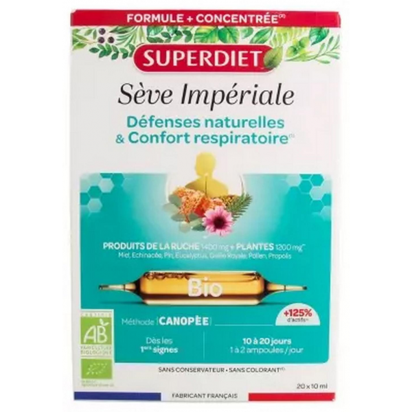 Association prestigieuse, la Sève Impériale des Laboratoires SUPERDIET associe les ingrédients les plus nobles de la ruche à de l’Argousier, de l’Eucalyptus, et du Pin.