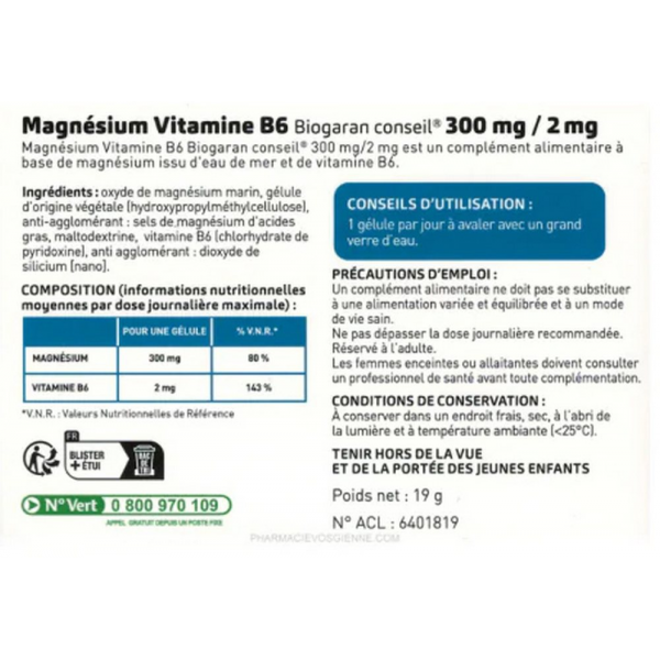 Biogaran Magnésium Vitamine B6 300 mg / 2 mg Gélules x 30