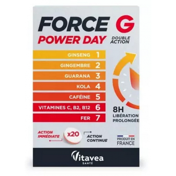 Agent de charge: sorbitol; stabilisant : hydroxypropylmethylcellulose; vitamine C; extrait de guarana (Paullinia cupana); extrait de kola (Cola nitida); caféine minéral : bisglycinate de fer; extrait de gingembre (Zingiber officinale); extrait de ginseng (Panax ginseng); anti-agglomérant : sels de magnésium d-acides gras; vitamines: B12 et B2.