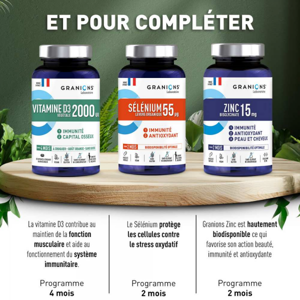 La vitamine D se trouve dans l'alimentation et en s'exposant au soleil. Cependant d'après une étude de SUVIMAX, 70% des adultes auraient un apport insuffisant en vitamine D. Les laboratoires Granions vous propose ce complément alimentaire pour combler ces carences.