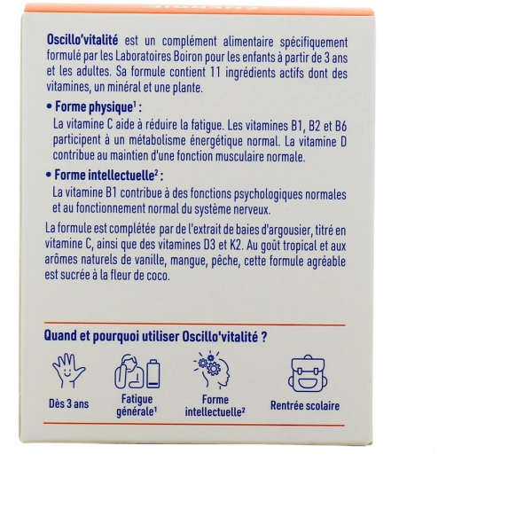 Oscillo’vitalité dès 3 ans est un complément alimentaire à base d’extrait de baies d’Argousier titré en Vitamine C, Zinc, Vitamines B1, B2, B3, B6, B8, B9, B12, D3 et K2 spécifiquement formulé pour maintenir la forme physique(2) et intellectuelle(3) des enfants dès 3 ans au quotidien.