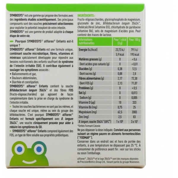Ingrédients : Fructo-oligosaccharides, glycérophosphate de magnésium, gluconate de zinc, anti-agglomérant : sels de magnésium d'acides gras, Bifidobacterium longum 35624™, cholécalciférol (vitamine D3), chlorohydrate de pyridoxine (vitamine B6). Peut contenir des traces de lactose.
