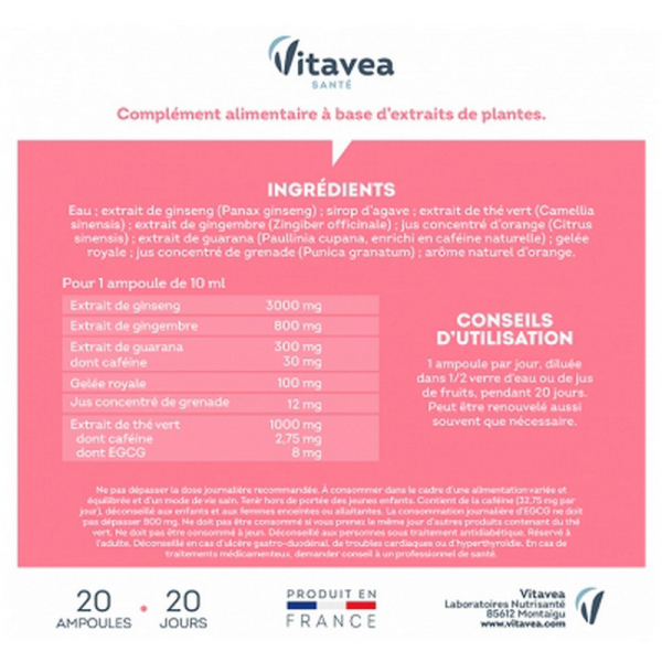 Eau ; extrait de ginseng (Panax ginseng) ; sirop d-agave ; extrait de thé vert (Camellia sinensis) ; extrait de gingembre (Zingiber officinale) ; jus concentré d-orange (Citrus sinensis) ; extrait de guarana (Paullinia cupana enrichi en caféine naturelle) ; gelée royale ; jus concentré de grenade (Punica granatum) ; arome naturel d-orange.