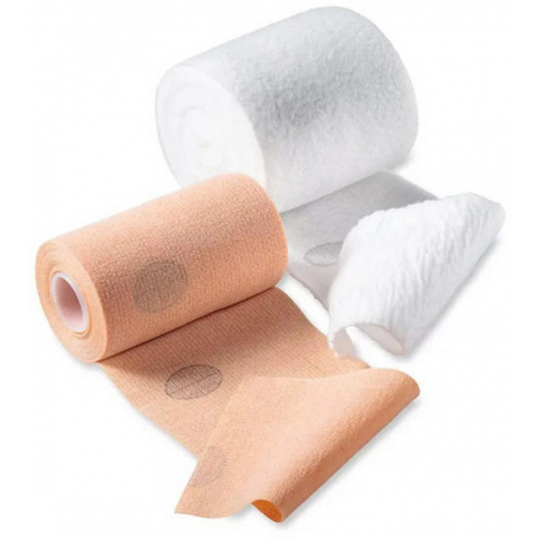 - d'une bande KPress cohésive à allongement long, de couleur chair, maintenant le bandage en place et apportant la pression additionnelle nécessaire pour atteindre la pression thérapeutique recommandée.