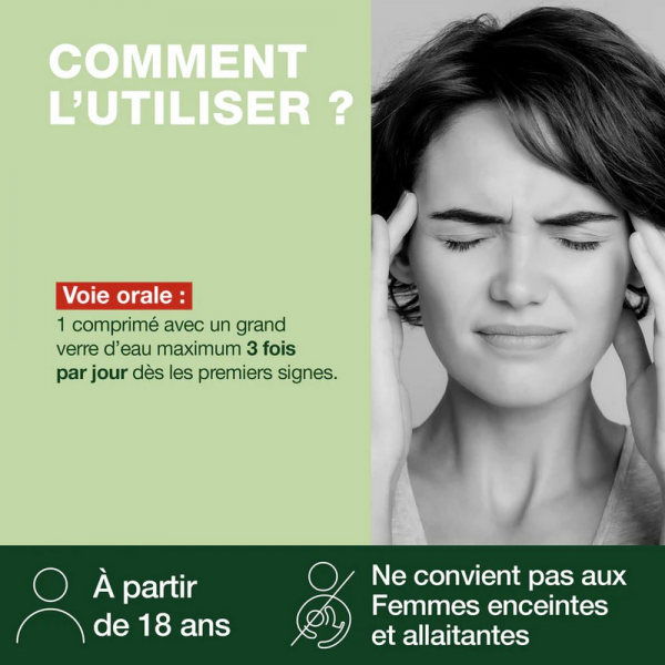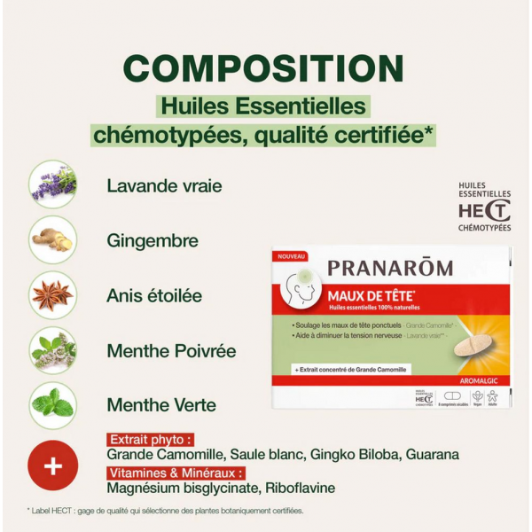 Anti-agglomérant : Cellulose microcristalline ;Magnesium bisclyginate 600 mg (eq. 108 mg Mg ? 28.8% AJR) ; Acacia senegal gum ; Extrait sec de saule blanc (Salix alba L. bark extract - Salicine 94,5mg) ? 315 mg; Extrait sec de Grande camomille 0.8% parthénolides (Tanacetum parthenium L. herb extract) ? 300 mg ; Extrait sec de Guarana (Paullinia cupana Kunth var. Sorbilis [Mart.] Ducke? seed) ? 300 mg (eq. 150 mg caffeine) ; Anti-agglomérants : Carbonate de magnésium, Phosphate tricalcique ; Extrait sec de Ginkgo (Ginkgo biloba L. leaf extract) ? 75 mg ; Huile essentielles de lavande vraie (Lavandula angustifolia - 60 mg), de Gingembre (Zingiberoffcinale ? 30 mg) et d'Anis étoilée (Illicium verum?30 mg) ; Anti-agglomérant : Sels de magnésiumd'acide gras ; Huiles essentielles de Menthe poivrée(Mentha x piperita 15 mg) et Menthe verte (Menthaspicata ? 15 mg) ; Riboflavine (Vitamine B2) 1.79 mg(eq. 1.50mg Vit. B2 ? 107% AJR); Agent d'enrobage :hydroxypropylmethylcellulose, amidon modifiéprégélatiné, talc, hydroxypropylcellulose, acidestéarique.