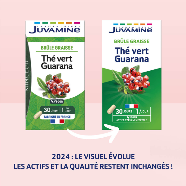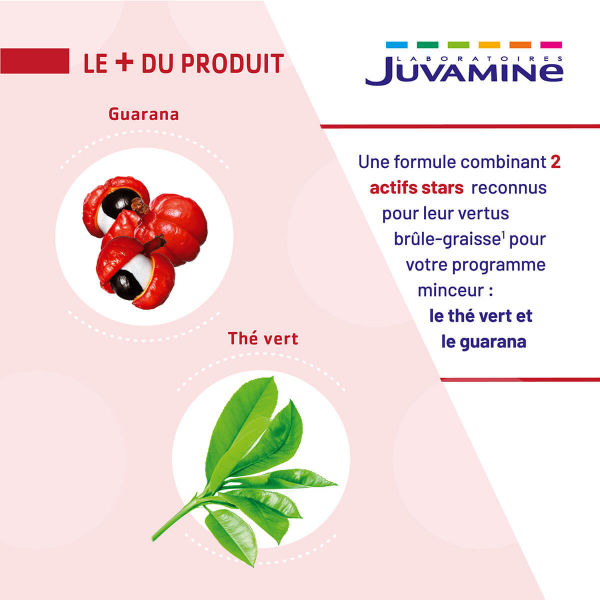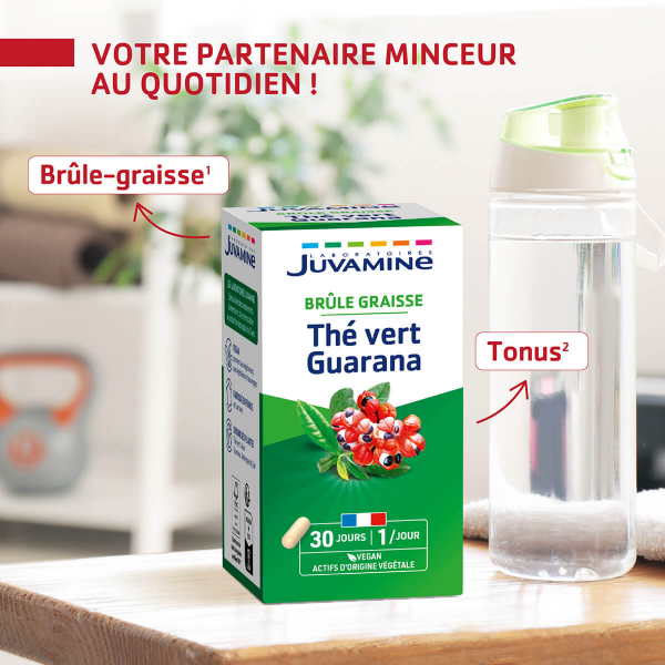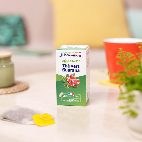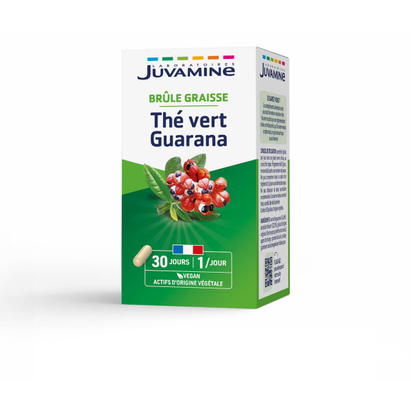 Juvamine Thé Vert Guarana, disponible en 30 gélules, est un complément alimentaire à base de thé vert et de guarana, combinant les propriétés éliminatrices de l'eau et de dégradation des graisses du thé vert avec les bienfaits toniques et stimulants du guarana, particulièrement utiles pour contrer les baisses d'énergie fréquentes lors des régimes, le tout dans une formule végan fabriquée en France.