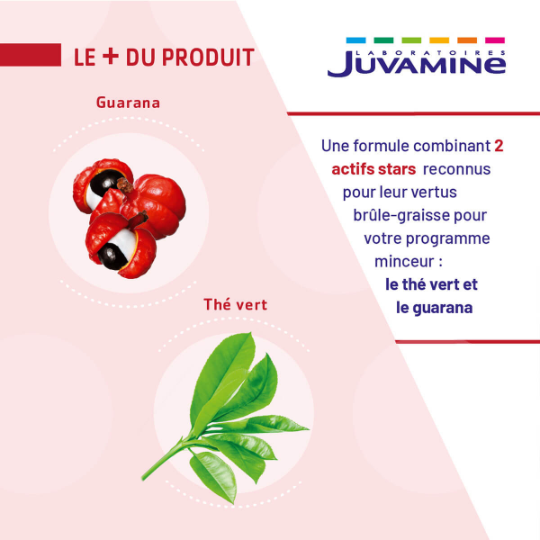 Extrait de guarana 39,9%, Extrait de thé vert 29,5%, Gélule végétale (Hydroxypropylméthylcellulose), Agent de charge : Sorbitol, Antiagglomérant : Sels de calcium d'acides gras.