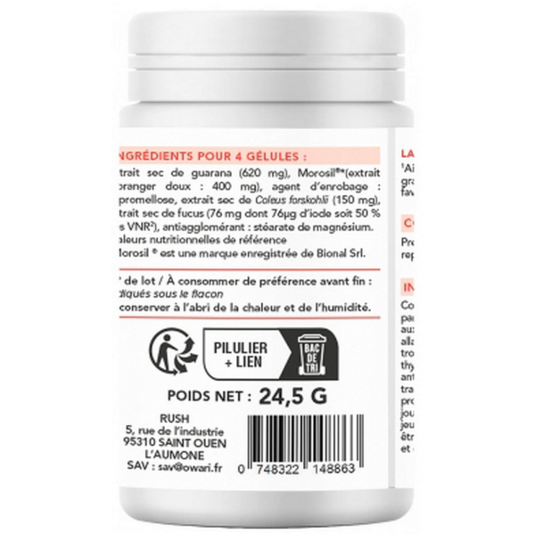 Extrait sec de guarana (620 mg) Morosil®*(extrait d-oranger doux : 400 mg) agent d-enrobage : hypromellose extrait sec de Coleus forskolhii (150 mg) extrait sec de fucus (76 mg dont 76mcg d-iode soit 50 % des VNR2) antiagglomérant : stéarate de magnésium.