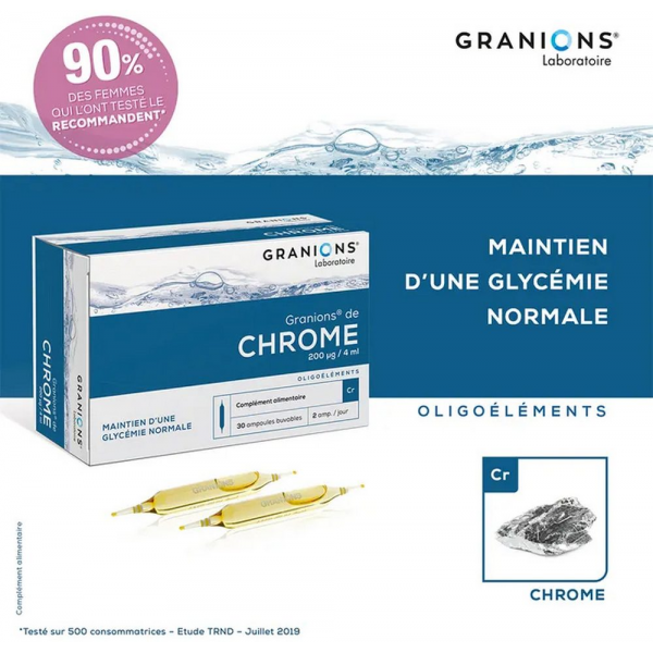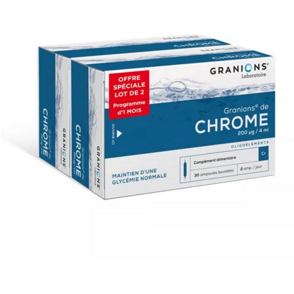 Le chrome est un oligo-élément essentiel pour le métabolisme des glucides et des lipides. En effet, il favorise l'activité et contribue à faciliter l'utilisation du glucose.