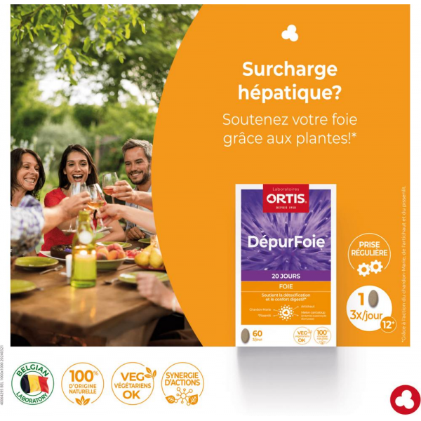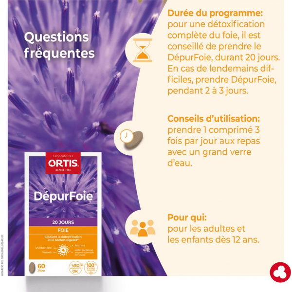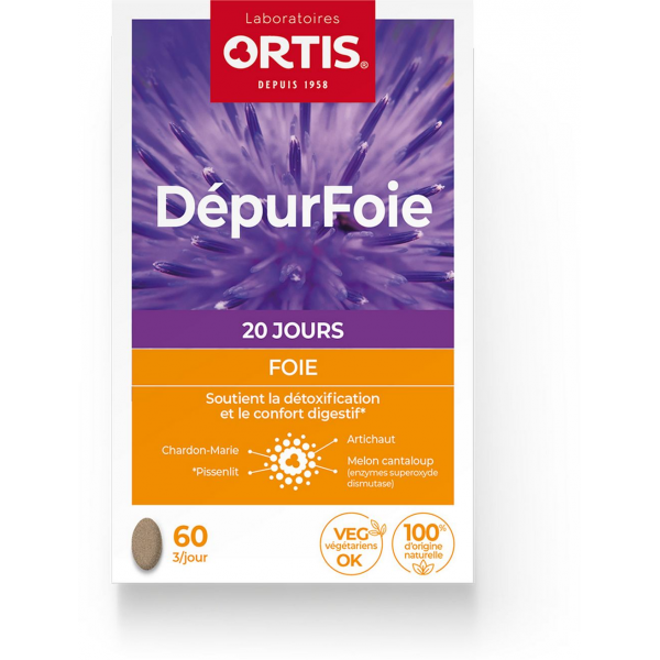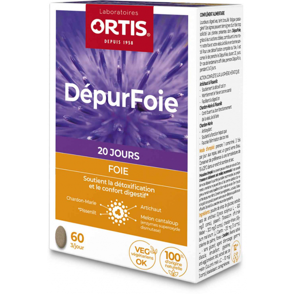 Le complément alimentaire DEPURFOIE 60 comprimés, classé dans la catégorie des détoxifiants, est la solution idéale et 100% naturelle pour nettoyer et détoxifier votre foie en profondeur. En cas de lourdeurs digestives, de fatigue passagère causée par des excès, DEPURFOIE soutient les fonctions du foie et des voies biliaires pour une action complète sur la sphère hépatique. Sa formule associant les bienfaits de l'artichaut, du pissenlit, du chardon-Marie et des fibres d'avoine facilite la détoxification, maintient le foie en bonne santé, contribue au bon fonctionnement de la vésicule biliaire et soutient la fonction hépatique tout en favorisant l'élimination des toxines.