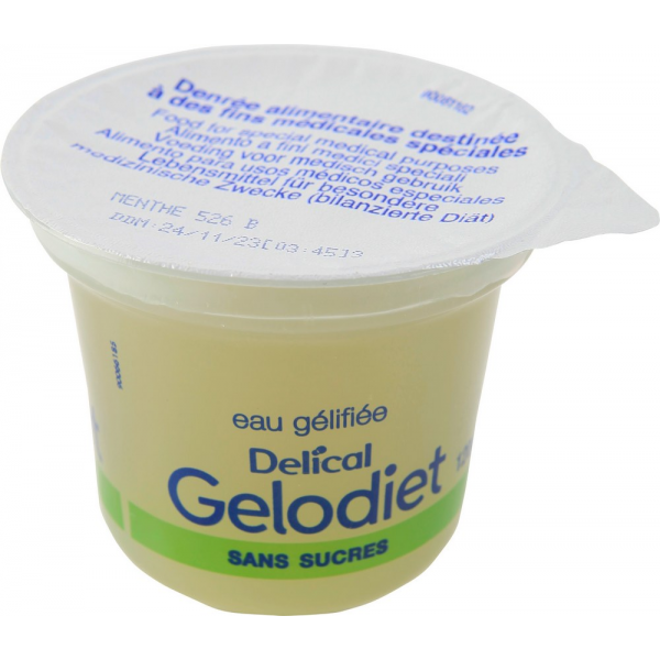 L'eau gélifiée sans sucres Menthe Gelodiet permet d'avoir des apports hydriques suffisants même quand avaler un liquide n'est plus possible. La composition convient aux diabétiques et aux enfants à partir de 3 ans.