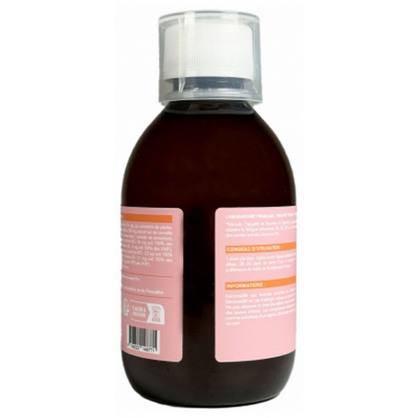 Eau stabilisant: glycérine L-glutamine (750 mg) jus concentré de peche arome the peche extrait sec de gingembre (250 mg) extrait sec de cannelle (100 mg) acidifiant acide citrique conservateur: sorbate de potassium VNR) pantothénate de calcium (vitamine B5: 6 mg soit 100% des VNR) édulcorant: sucralose nicotinamide (vitamine 83: 16 mg soit 100% des colorant: beta-carotene cyanocobalamine (vitamine B12: 25 ?g soit 100% des VNR) chlorhydrate de thiamine (vitamine B1: 11 mg soit 100% des VNR) acide folique (vitamine B9: 200 mcg soit 100% des VNR).