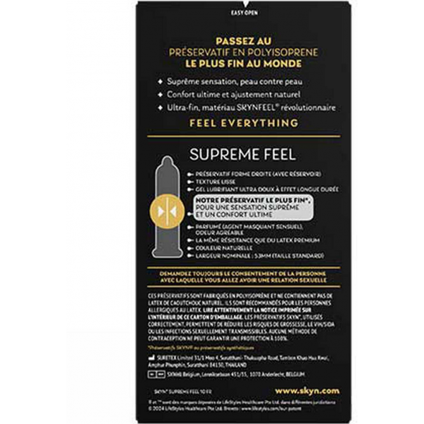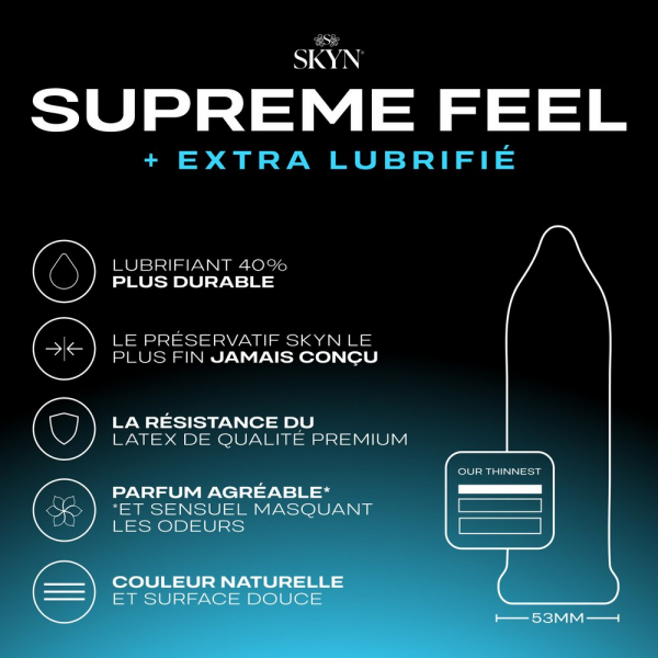 Avec une épaisseur inférieure à 60 microns, Skyn Supreme Feel Extra Lubrifié appartient à la catégorie des préservatifs ultra-fins. Il permet de préserver un maximum de sensations tout en respectant les normes de qualité et de sécurité en vigueur, notamment la certification CE. C’est un choix adapté aux couples qui souhaitent allier protection, confort et intensité des sensations.