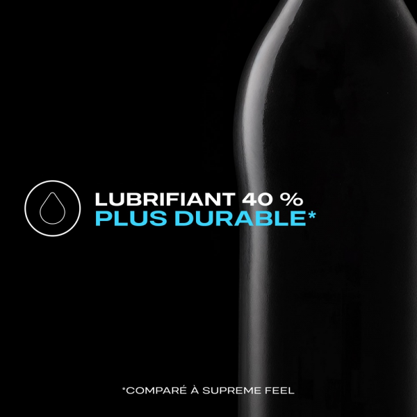 Cette version Extra Lubrifiée contient environ 40 % de gel lubrifiant en plus par rapport au Supreme Feel classique. La glisse est ainsi plus généreuse, ce qui favorise un contact plus doux et une sensation plus fluide pendant les rapports. La texture lisse et la forme droite avec réservoir assurent une utilisation confortable et intuitive.