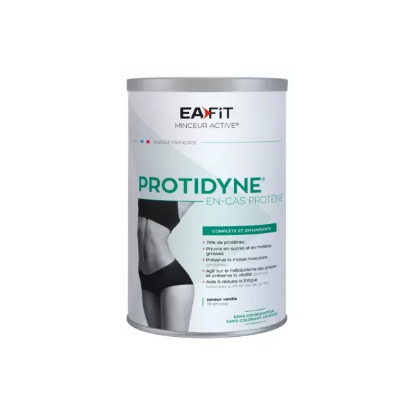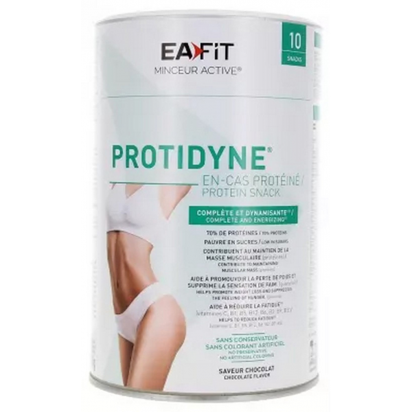En outre, le PROTIDYNE® est recommandé pour agir sur le métabolisme des graisses, préserver la vitalité grâce au guarana, préserver la masse musculaire grâce aux protéines, aider à réduire la fatigue grâce à un large spectre de vitamines, et apporter des fibres d'origine végétale. Il est conseillé de prendre 1 en-cas* PROTIDYNE par jour, accompagné de légumes à volonté ainsi qu’un fruit. Ce produit peut également être utilisé en collation, en remplacement de l’en-cas habituel.