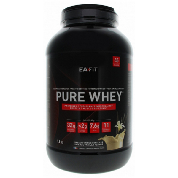 La PURE WHEY VANILLE INTENSE est composée de concentrat de protéines de lactosérum (42,7%), isolat de protéines de lactosérum (41%), hydrolysat de protéines de lactosérum (10%), arômes, épaississant, l-glutamine, l-arginine HCL, minéraux, édulcorants, taurine, vitamines et un complexe enzymatique. Sa formule contient également des traces possibles de céréales contenant du gluten, d'oeufs, de fruits à coques, de céleri et de sulfites.
