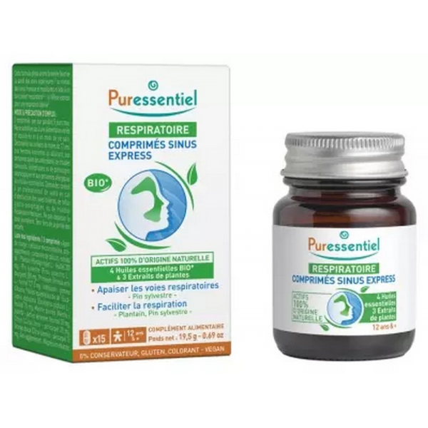 Puressentiel Sinus Express sous forme de comprimés vous aide à retrouver une respiration facile grâce à des sinus propres et apaisés.