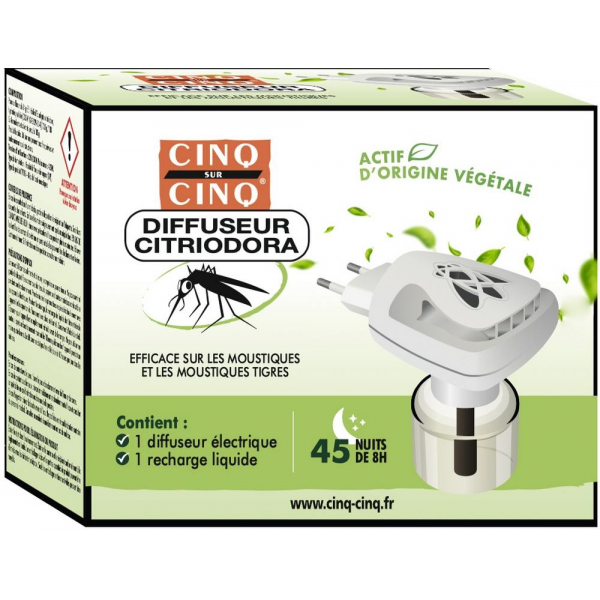 CINQ SUR CINQ Diffuseur Citriodora est une solution naturelle et efficace pour vous protéger des piqûres de moustiques, y compris des moustiques tigres (Aedes albopictus), principaux vecteurs de maladies comme la dengue, le chikungunya et le virus Zika.
